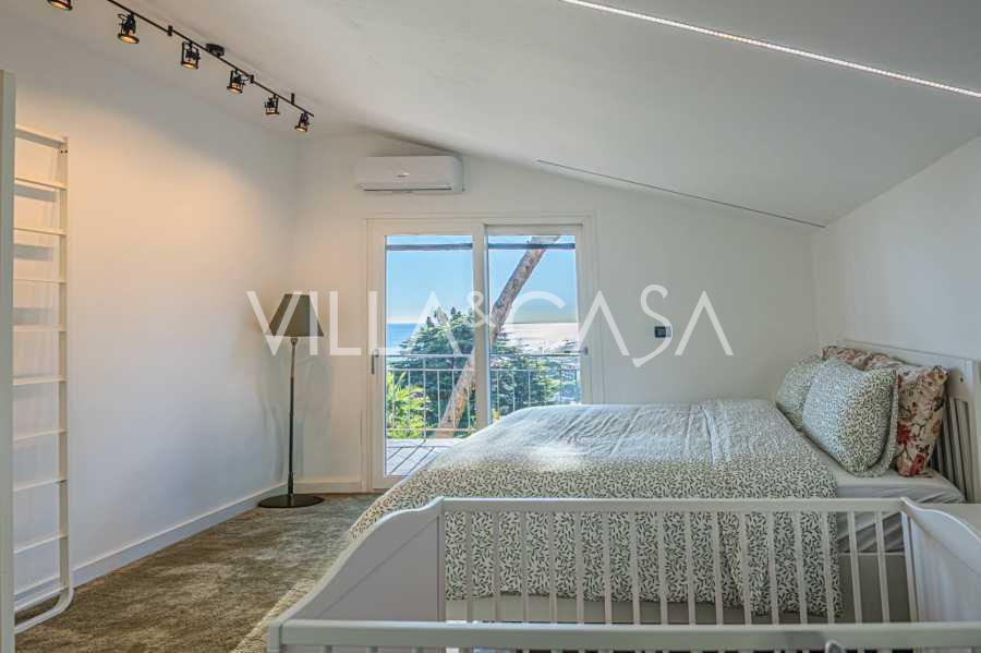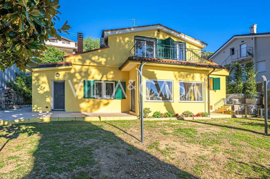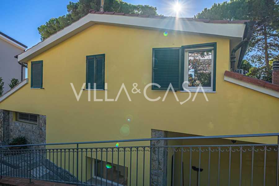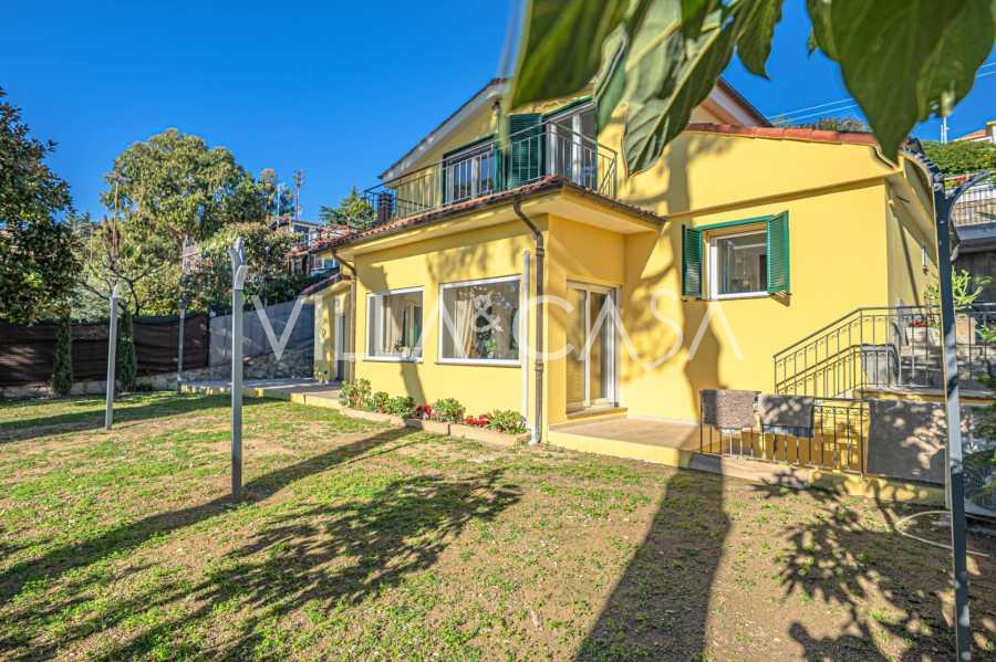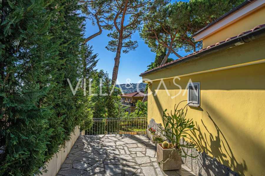 Huvila sijaitsee rauhallisella asuinalueella, kohoaa kolmelle kerrokselle ja sitä ympäröi hyvin hoidettu yksityinen puutarha, josta avautuvat lumoavat näkymät siniselle merelle ja rannikon vehreille rinteille.