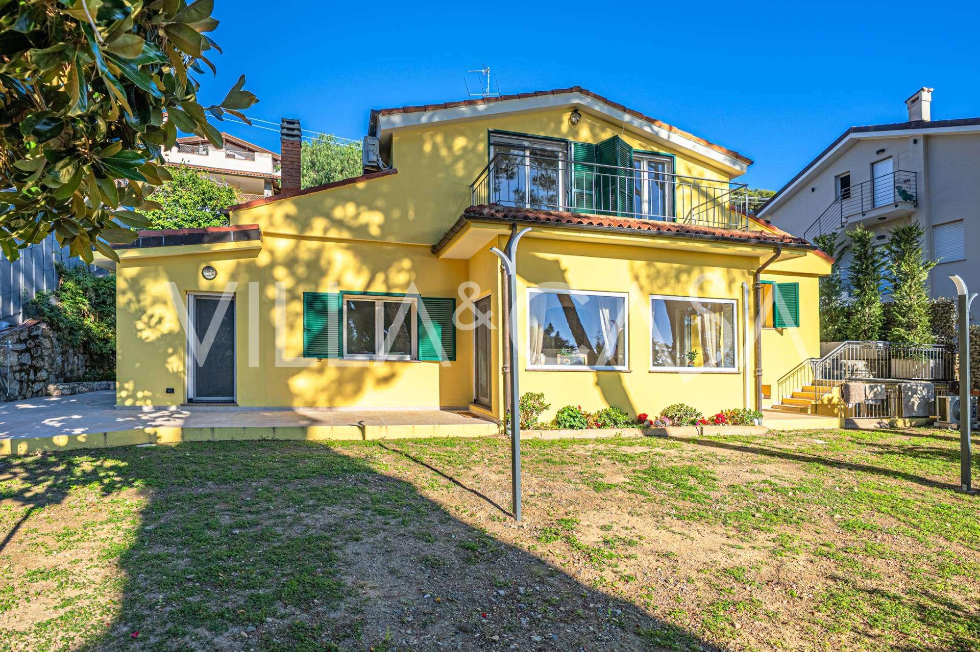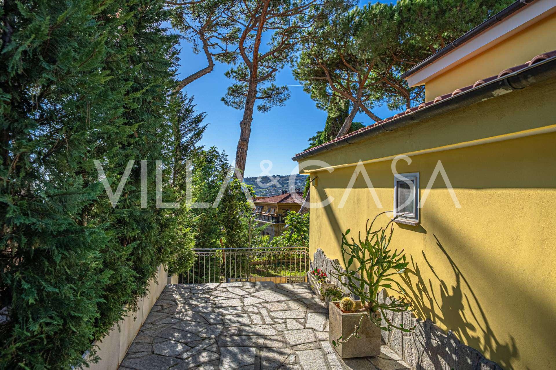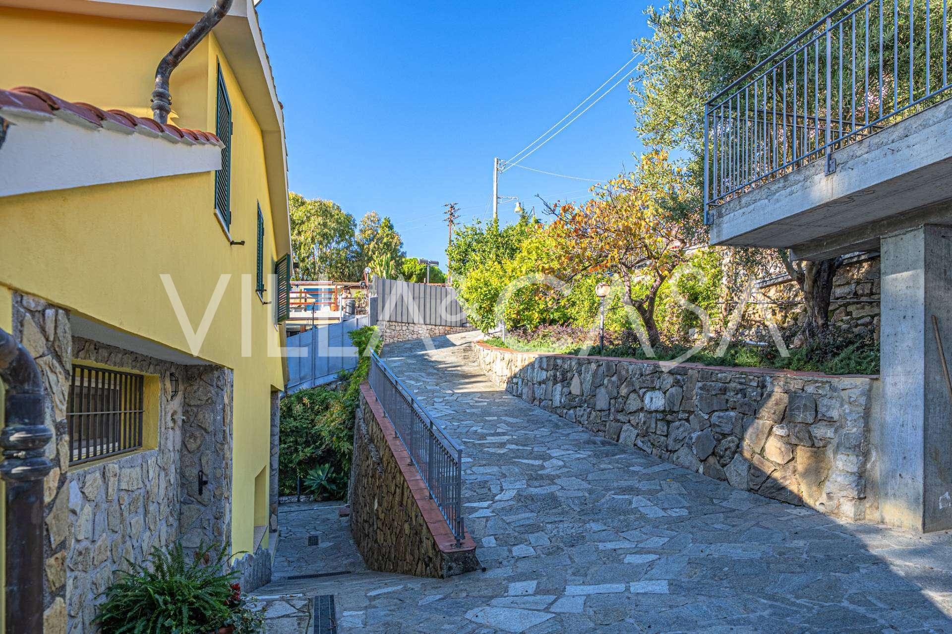Huvila sijaitsee rauhallisella asuinalueella, siinä on kolme tasoa ja sitä ympäröi hyvin hoidettu yksityinen puutarha, josta avautuvat lumoavat näkymät siniselle merelle ja rannikon vihreille kukkuloille.