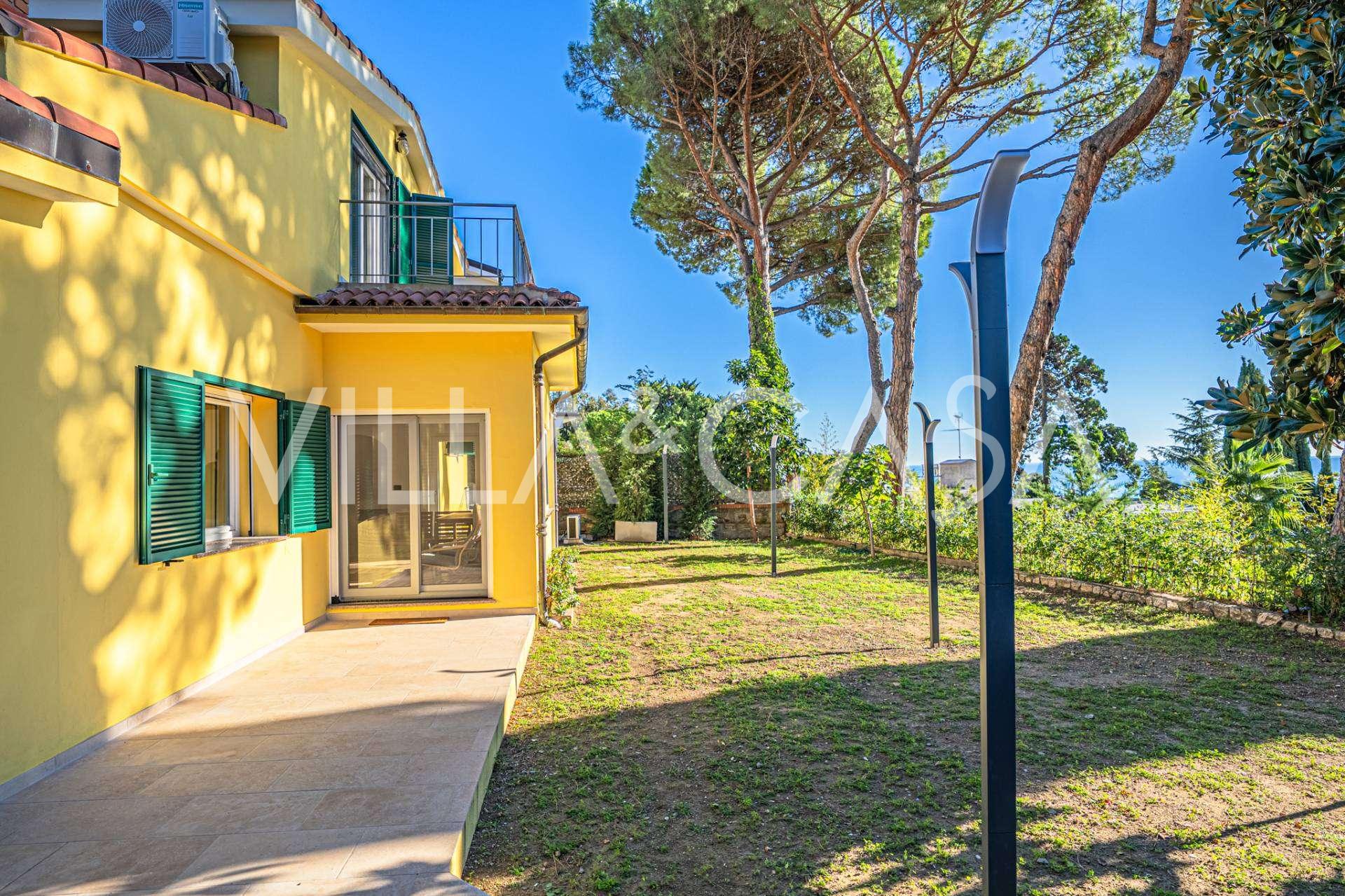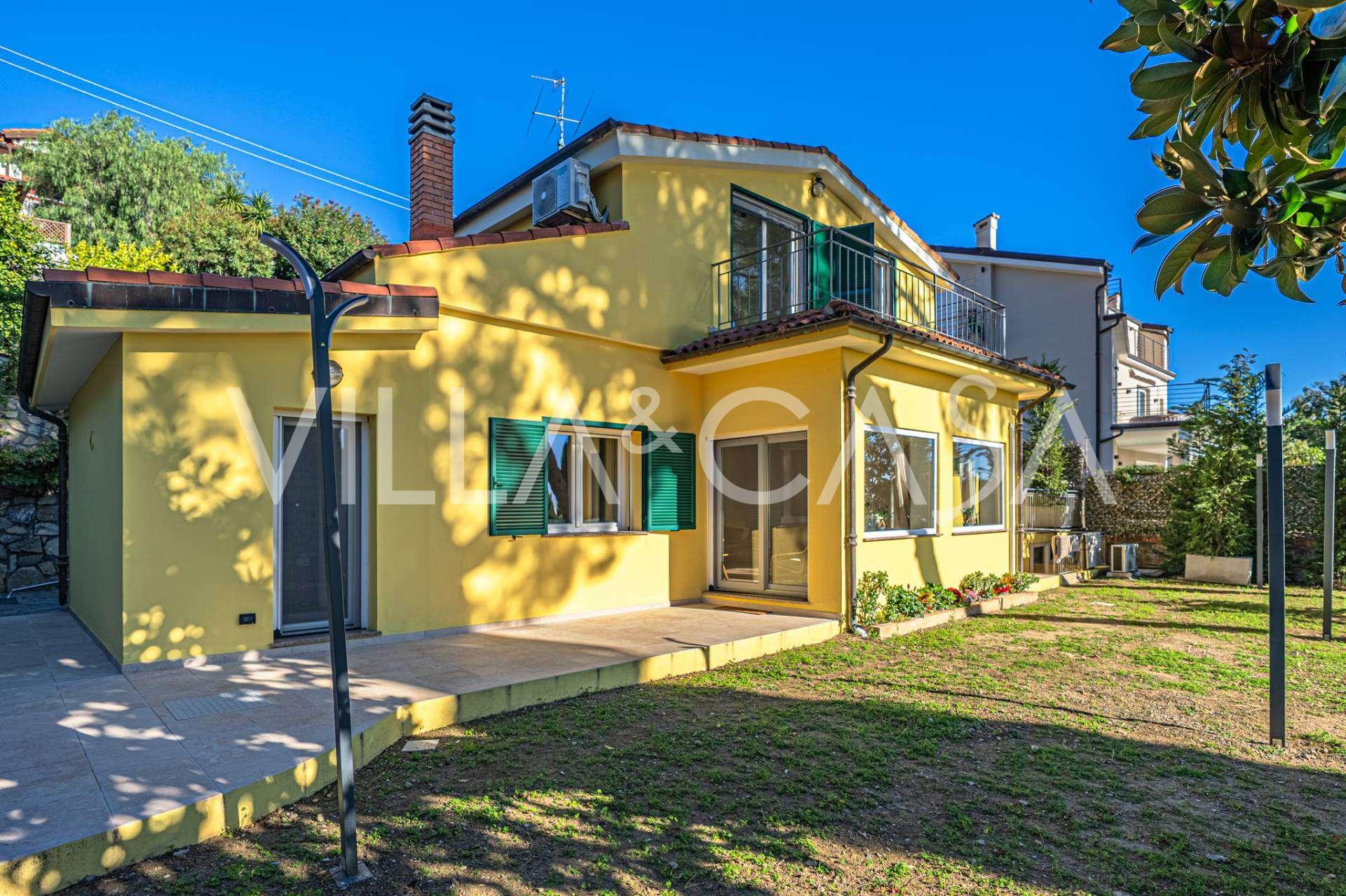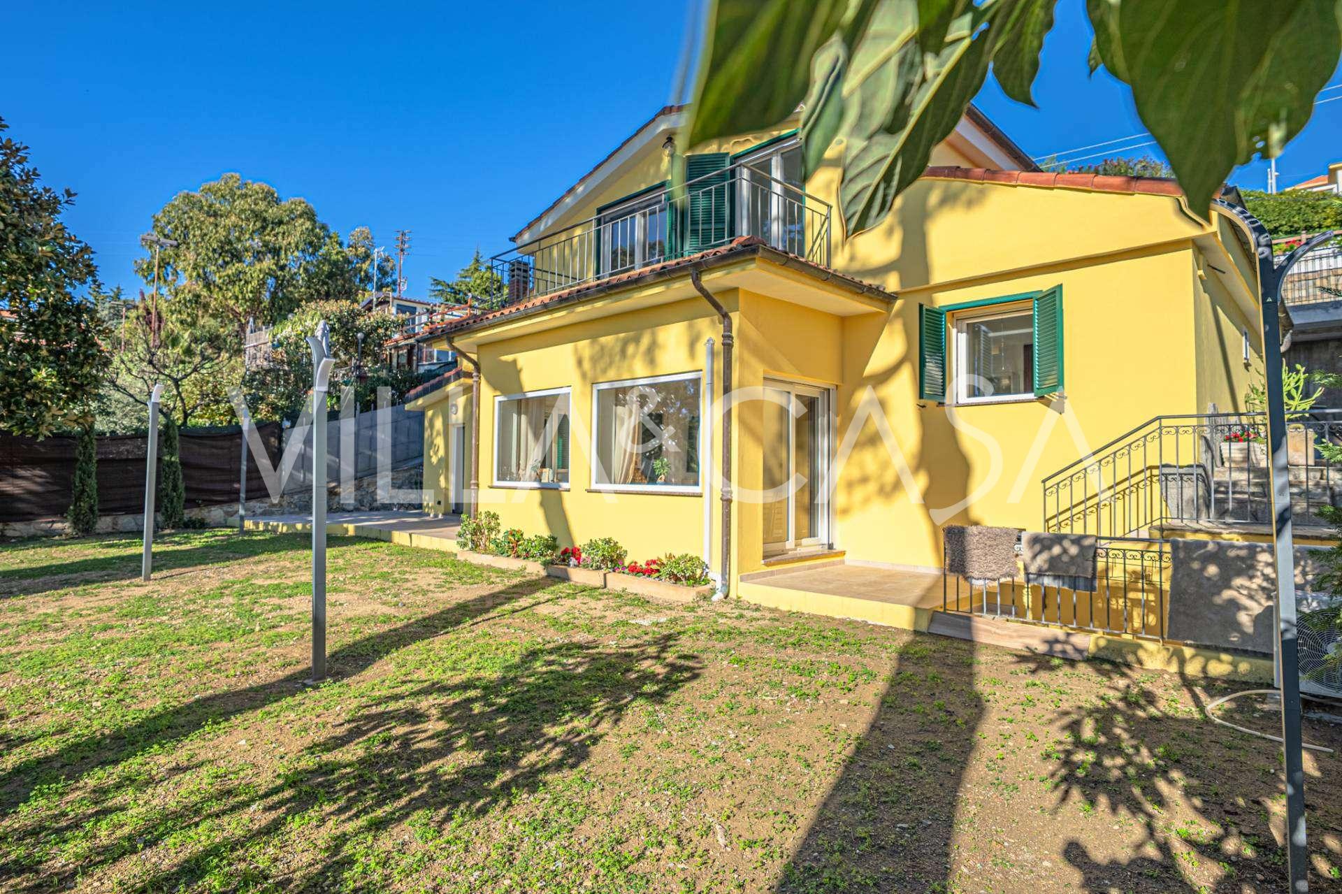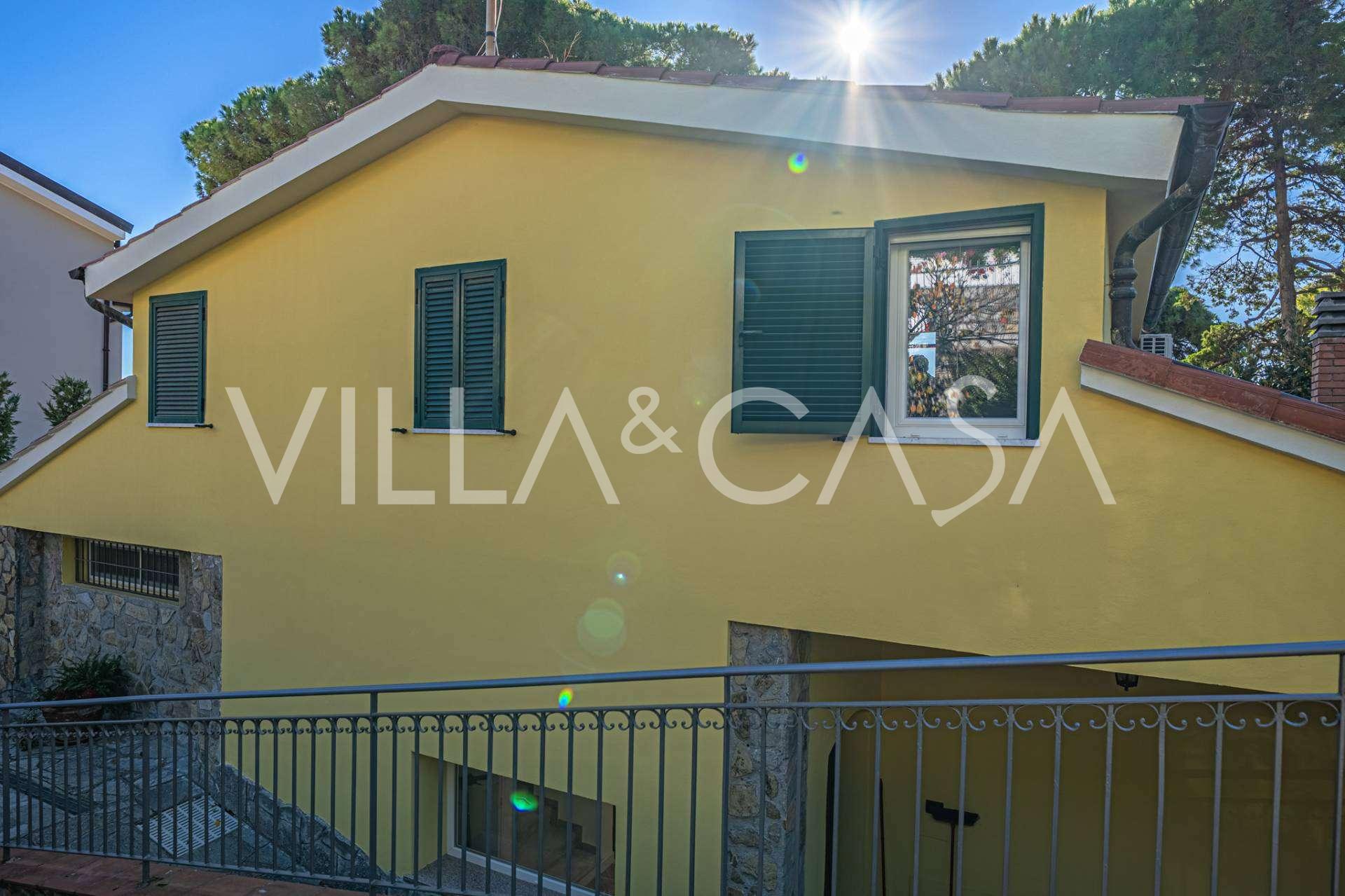 Huvila sijaitsee rauhallisella asuinalueella, siinä on kolme tasoa ja sitä ympäröi hyvin hoidettu yksityinen puutarha, josta avautuvat lumoavat näkymät siniselle merelle ja rannikon vihreille kukkuloille.