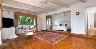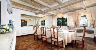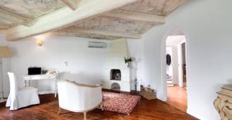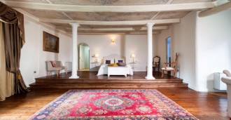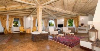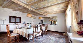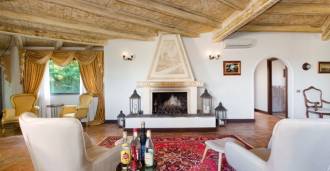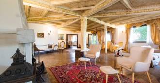 • tilavan juhlasalin, jossa on käsinmaalatut katot ja kivinen takka;